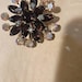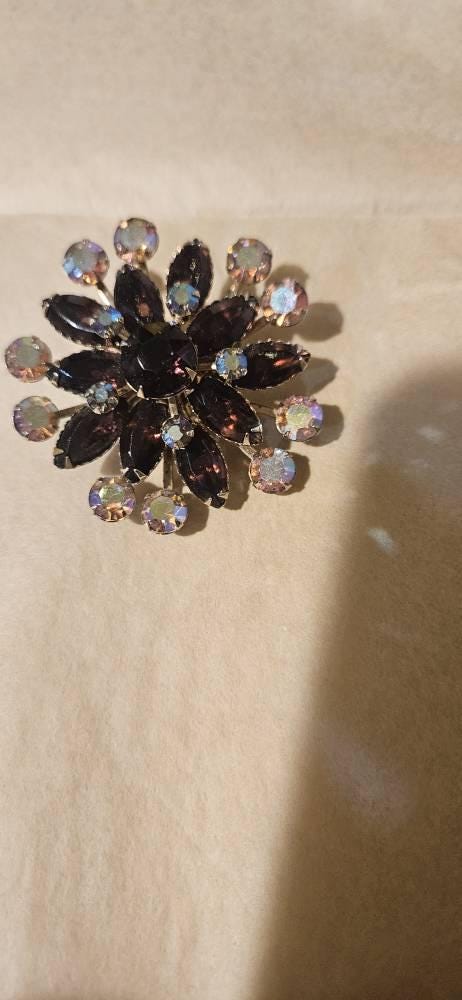 Vintage Blue Aurora Borealis Rhinestone Tiered Brooch. Made in the 1960s, this sparkling round cluster brooch features multiple layers of prong set round and marquise rhinestones in varied shades of blue, some with aurora borealis finish. The brooch is made of swedged construction with riveted components and is finished with an attached single point bar pin assembly with pin stem with no pin stop and roll over safety clasp. The brooch is in Very Good Vintage Condition, with no damage noted.