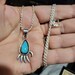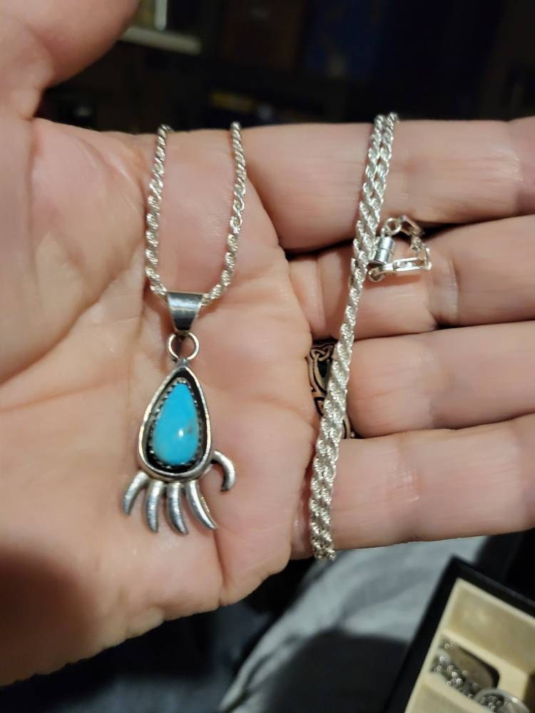 Vintage Sterling Silver Turquoise Bear Paw Necklace Pendant. A pear shaped cabochon of turquoise is set in a dogtooth bezel, above stylized bear toes. The pendant measures approximately 3/4 inch X 1 1/4 inch. Finished with klarge bale and stamped Sterling B on reverse. In very good vintage condition, with beautiful patina and no damage of any sort noted.