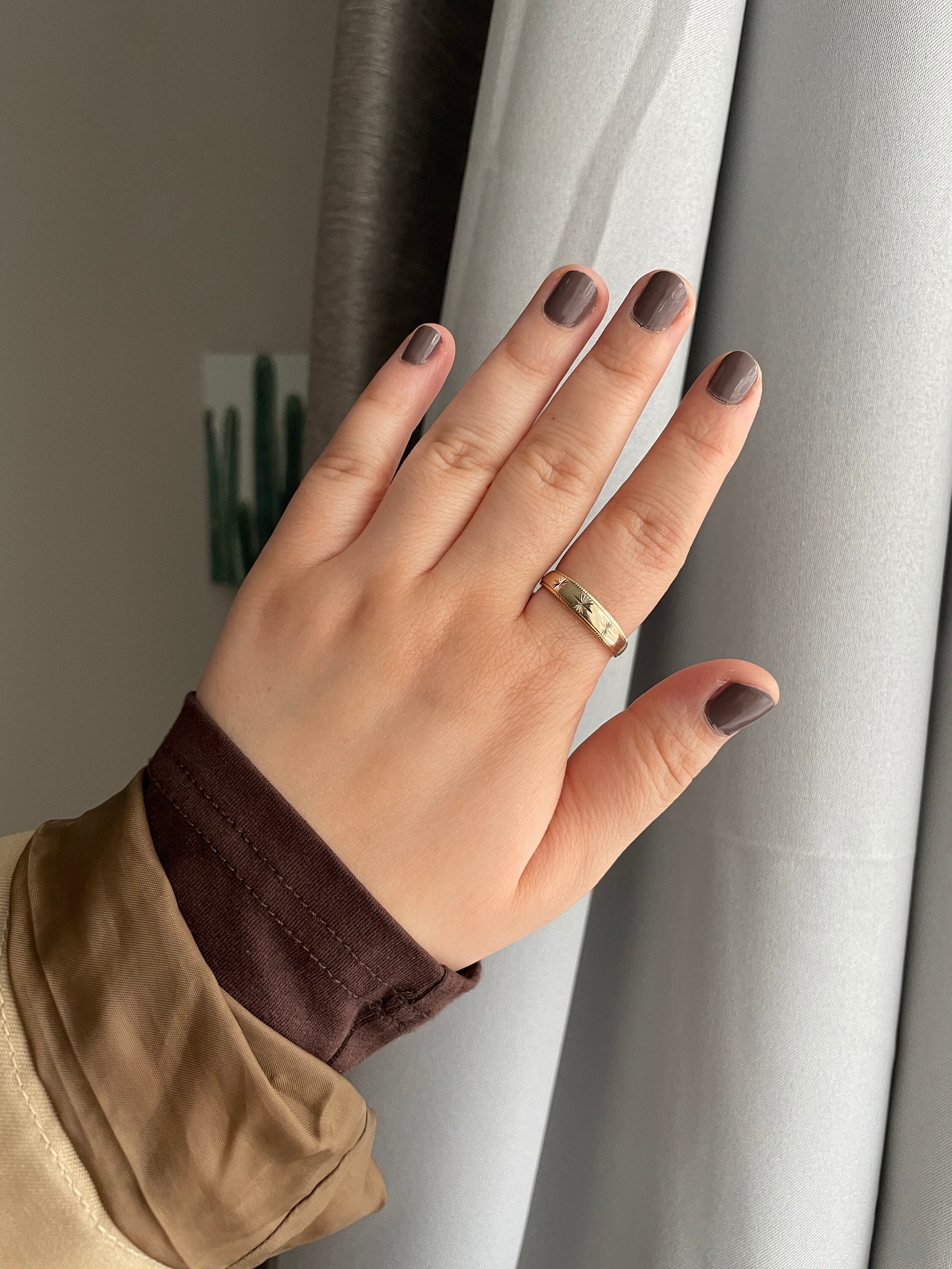 Vintage 14K Yellow Gold Starburst Engraved Wedding Ring. Made in the 1960s, this Mid Century modern ring is decorated with three engraved starbursts. This tapered band is a size 10 1/2. It is in good vintage condition with the patina of decades of wear and slightly out of round.