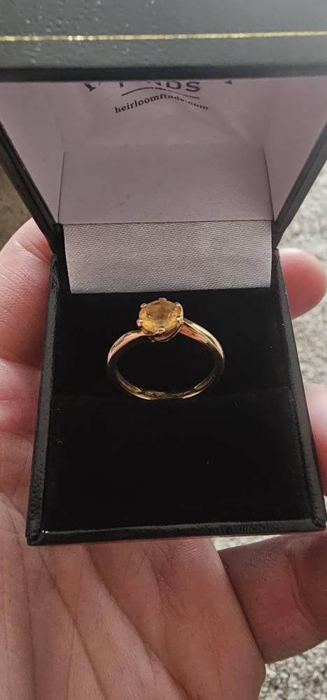 Vintage 14K Golden CZ Solitaire Ring. Set in a six prong twisted head atop a bypass shank, this round faceted golden yellow colored cubic zirconia makes a subtle and elegant statement. The 14K yellow gold ring is a size 6 and is in very good vintage condition with minor surface scratches commensurate with wear and no damage.
