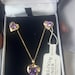 Vintage Heart Shaped Amethyst Diamond 14K Gold Necklace Earrings. Made in the 1980s, this set features a beautiful pendant necklace with one heart cut faceted amethyst set in a three prong mounting accented with two round brilliant cut diamond prong set on the wide gold bezel. The pendant is finished with a movable bale and is suspended from a 15 inch fine drawn chain finished with spring ring. The matching pierced earrings each have one heart cut amethyst with two round brilliant cut diamonds. They are finished with posts and butterfly backs for pierced ears. All pieces are in Very Good Vintage Condition, with no damage noted.