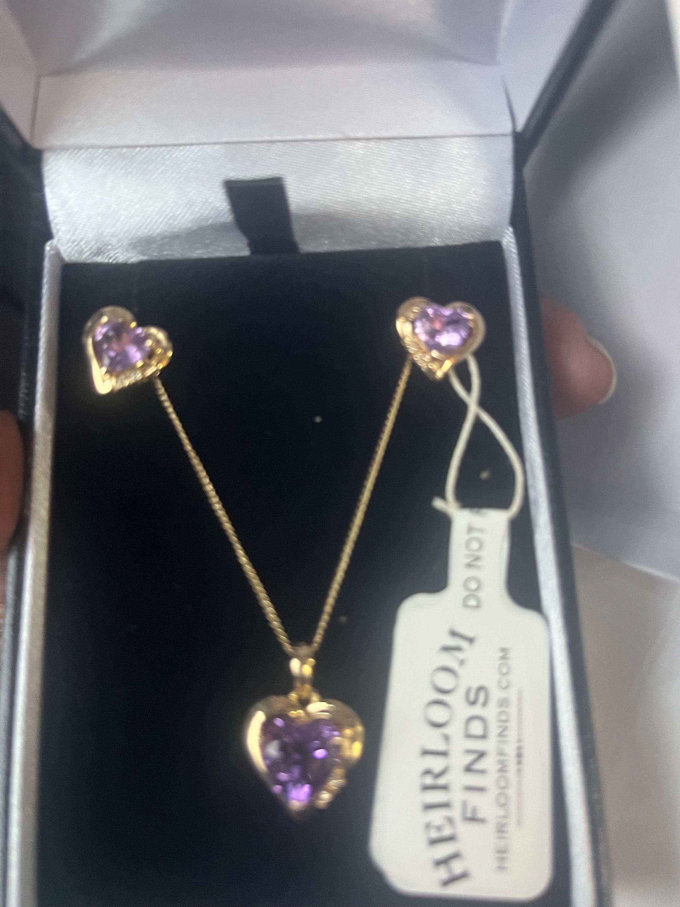 STONES: Pendant - One heart shaped amethyst weighing approximately 2 CT and two round brilliant cut diamonds weighing approximately .06 CT TW. Earrings - one heart shaped amethyst and two round brilliant cut diamonds weighing approximately .01 CT each.