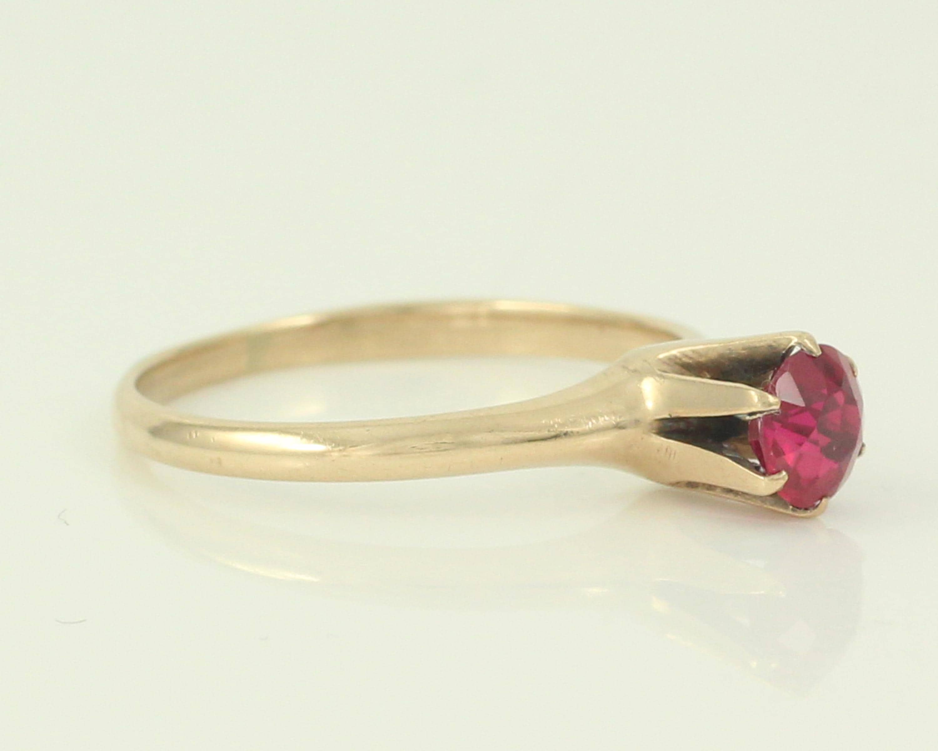 Antique 10K Lab Created Ruby Solitaire Ring. This simple elegant ring features a round faceted lab-created ruby in a high solitaire mounting with six claw prongs. The ring is in good antique condition, with a lovely patina to the gold and very minor facet abrasions. The ring is a size 7 1/4 and is marked 10KH .