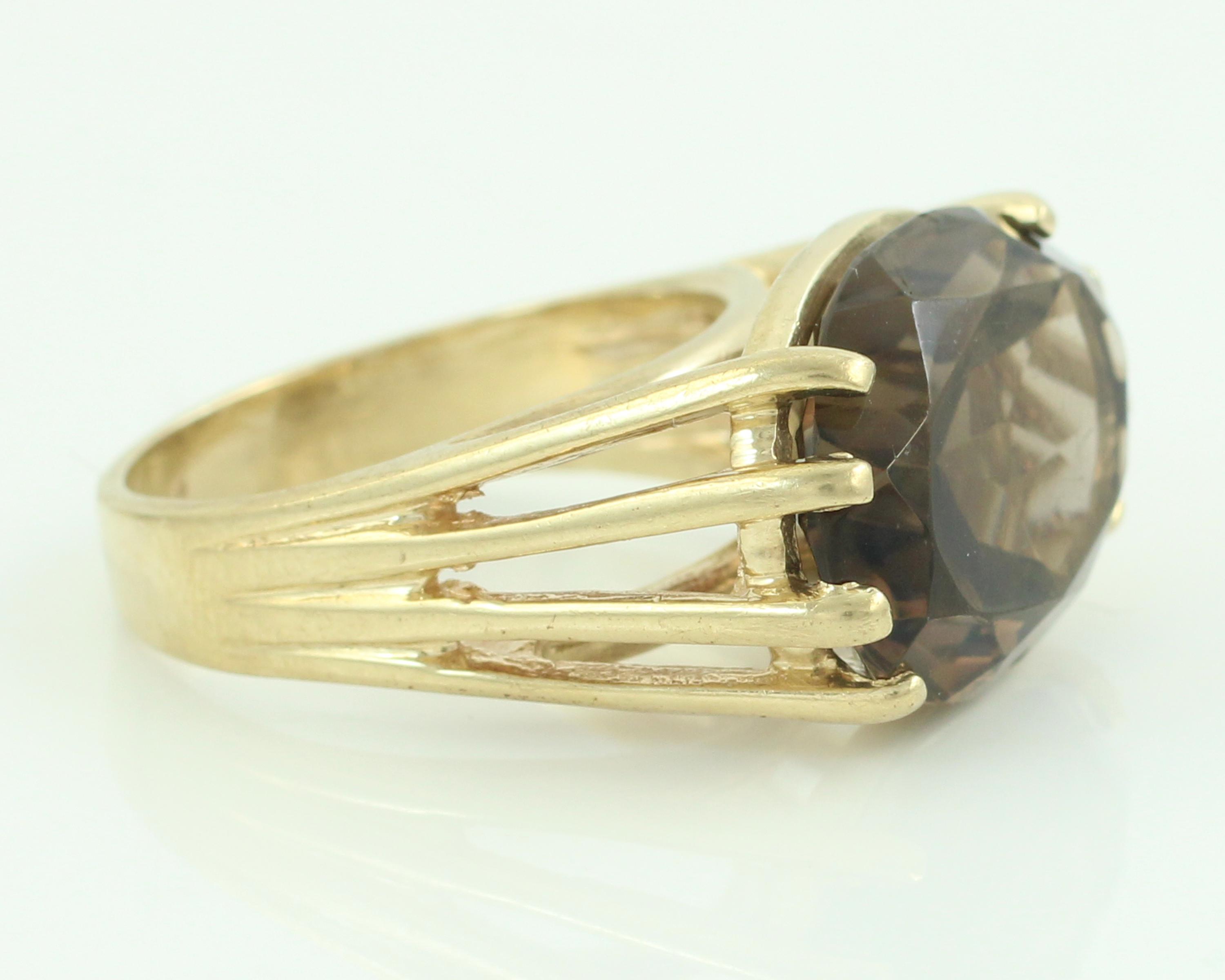 Vintage 10K Gold Smoky Quartz Ring. A large oval faceted smoky quartz of approximately 9 carats is set east-west in a 10K modernist raised mounting with four prongs on each of the ends. The ring is a size 6 3/4 and is marked B & F 10K on the interior. In good vintage condition with table facet scratches and two chips on the girdle (on opposite edges).