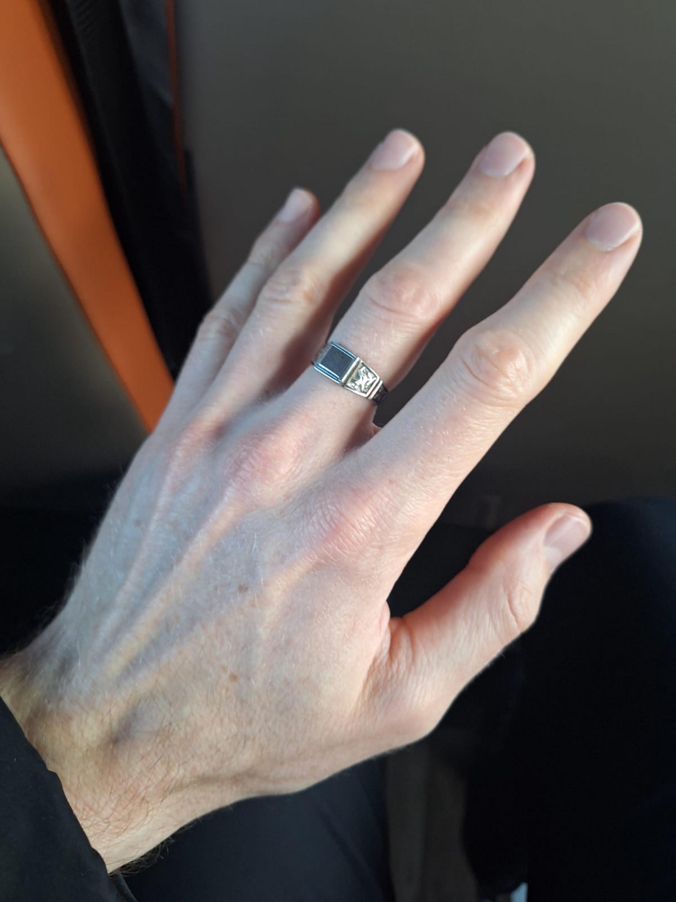 Victorian Coin Silver Small Signet Ring. This cast antique 900 silver signet ring has a small rectangular cartouche with squiggle etched border. The shoulders are decorated with stylized birds and leaves. The ring is stamped COIN under the signet. This mark was sometimes used on American made 900 silver made prior to the adoption of sterling silver as the standard in the late 1860s. The size 10 ring is in very good antique condition with minor surface wear and patina, but no damage noted. We are leaving the ring in as-found condition so you can polish as you prefer. The cartouche has never been engraved!