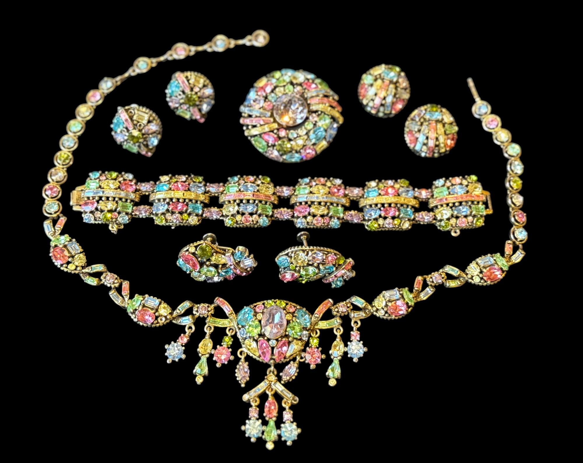 Vintage Hollycraft Pastel Rhinestone Necklace Earring Set. What a showstopper! This stunning necklace by Hollycraft is set with an array of pastel rhinestones in round, baguette, oval, and emerald shapes cover this antique gold tone necklace with dangles and drops. The necklace adjusts in length from 15 1/2" to 17 1/2" and is finished with a hook clasp. In-mold marks of Hollycraft and Copr.1955 on reverse of central ornament. The necklace is in very good condition with no damage noted. The matching earrings measure 7/8" X 1" and are finished with screw backs. The earrings are in fair condition with some missing stones.