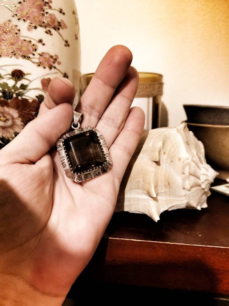 Vintage Mexican Silver Huge Smoky Quartz Pendant. This over sized artisan hand made pendant features a square cut Smoky Quartz set in a solid sterling pendant with dog tooth bezel and a pierced frame of alternating shiny and florentine stripes with scallop detail. The stone has a rich, even color and deep saturation. According to calculation by measurement, the stone weighs approximately 70 carats.